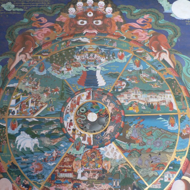 Der innerste Kreis zeigt die Antriebskräfte des Rades. Das sind die drei Geistesgifte Gier, Hass und Verblendung. Diese drei Gifte werden durch den Hahn oder die Taube (Gier), der Schlange (Hass) und des Schweins (Verblendung) dargestellt. Die drei Tiere beissen sich gegenseitig in den Schwanz und jagen sich rund um den Kreis. Die drei grundlegenden Kräfte welche Wesen im Lebenskreislauf halten sind also:- Gier - Prinzip der Anziehung